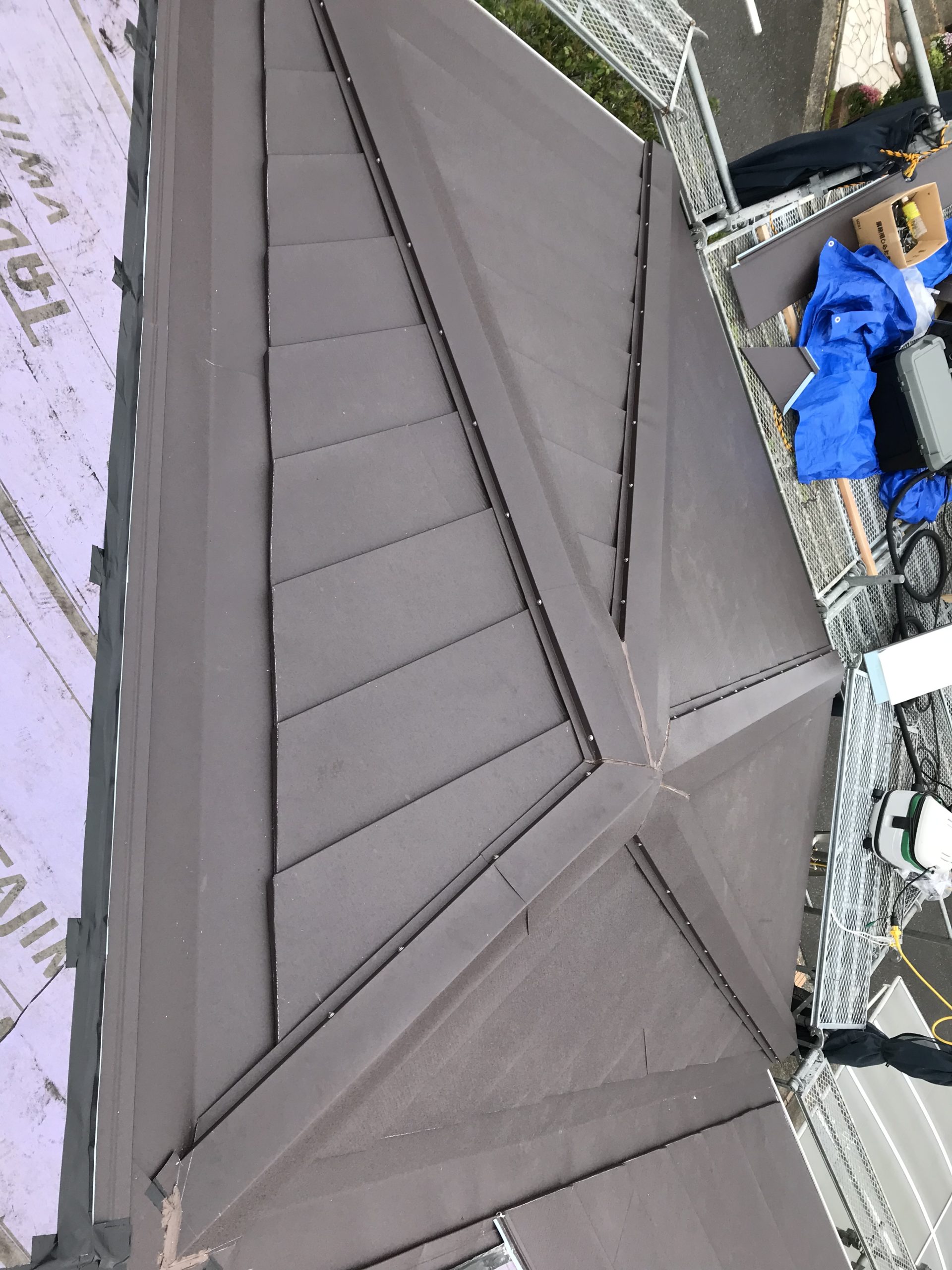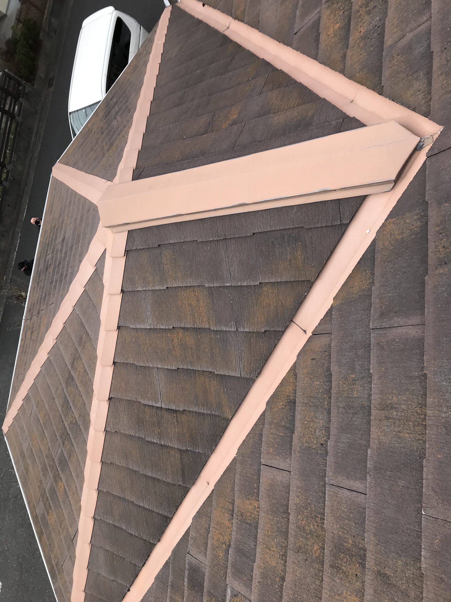 横須賀市のお客様 劣化により屋根材がひび割れや、欠けが多く カバー工法をお薦めし工事依頼を受けました。 大変な形状の屋根でしたが綺麗に仕上げる事ができご依頼ご夫妻に喜んでいただけました。