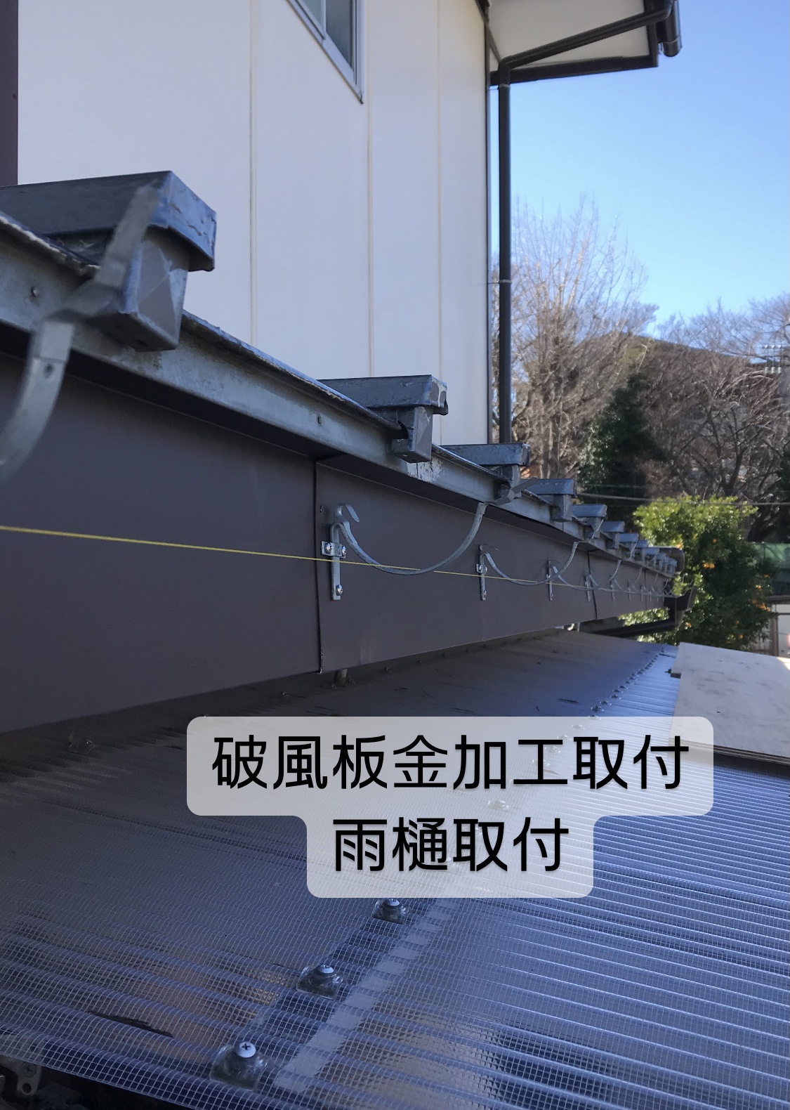 破風板がだいぶ腐食しており、板金だけでは対応できずベニヤ板を増し貼りで強化し 板金を取付け、既存の雨樋を復旧いたしました。
