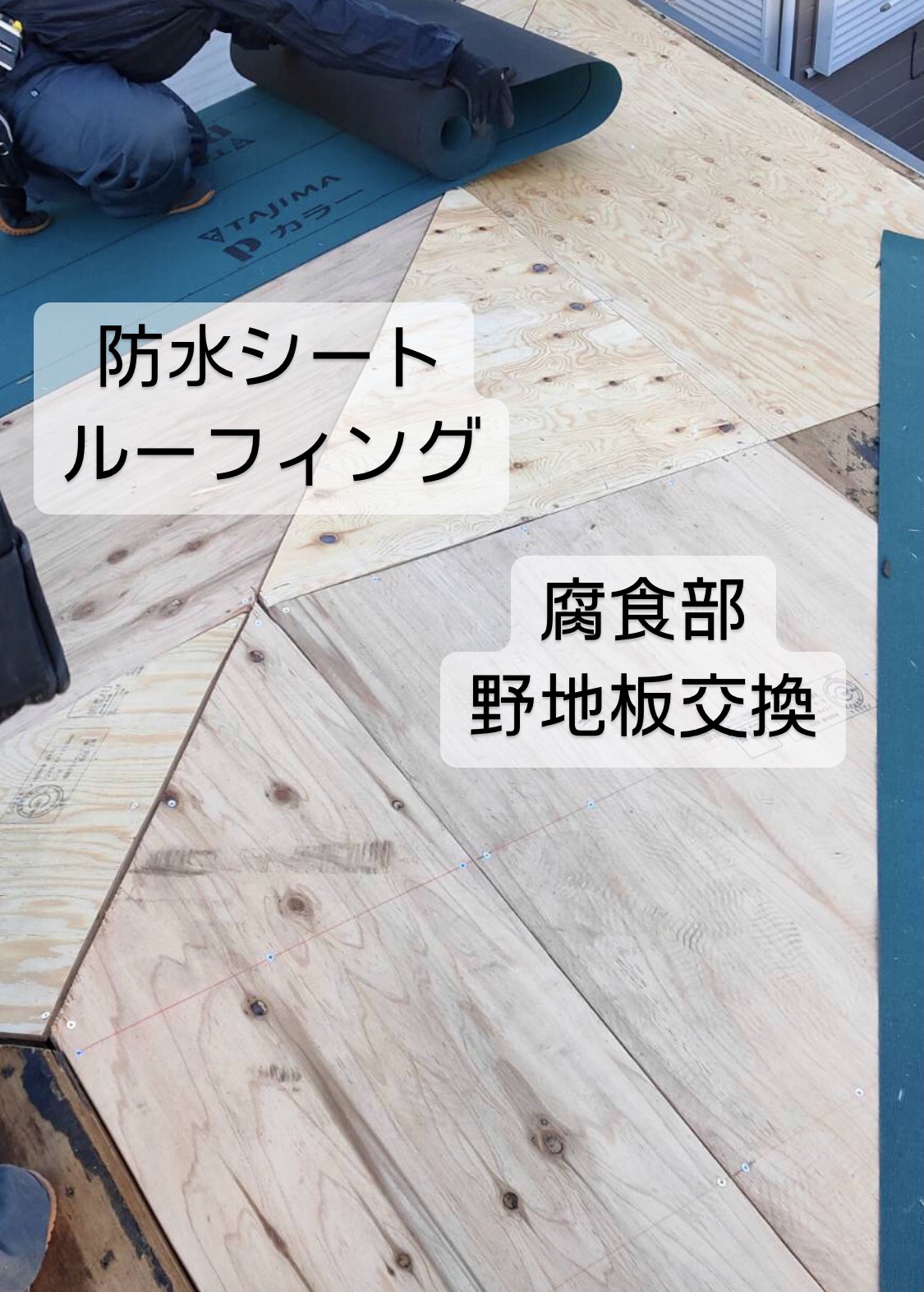 悪い部分を全て撤去し交換補修し 新しい木材を取り付け、野地板を貼り、防水シート(ルーフィング)を施工し、コロニアル葺き替えて一安心です。